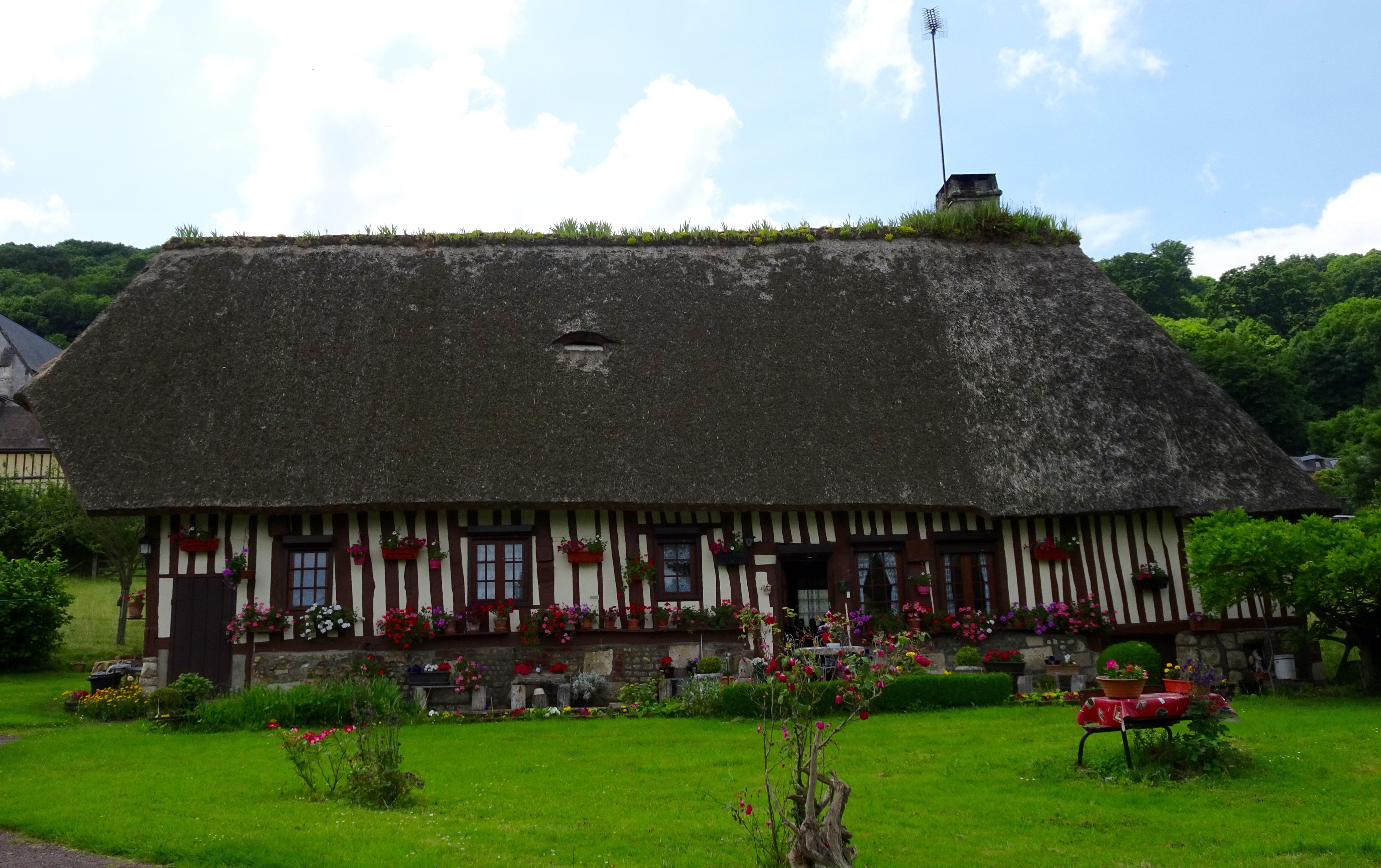 Etretat est le point le plus au Nord de notre périple. Nous commençons notre retour, direction le pont de Tancarville par de très très petites routes de campagne très agréables (les champs de lin commencent à fleurir). Sortis du pont de Tancarville (sans problème) nous coupons de nouveaux par de petites routes à travers le Marais Vernier. Havre de calme il révèle de magnifiques maisons aux toits de chaume.